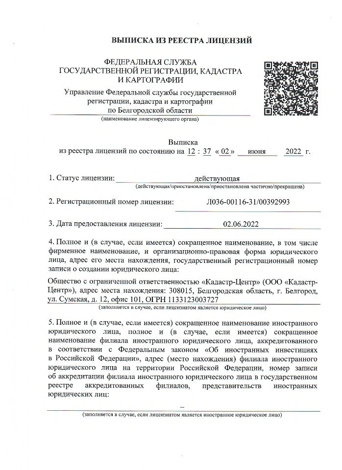 государственная лицензия на деятельность ООО "Кадастр-Центр"